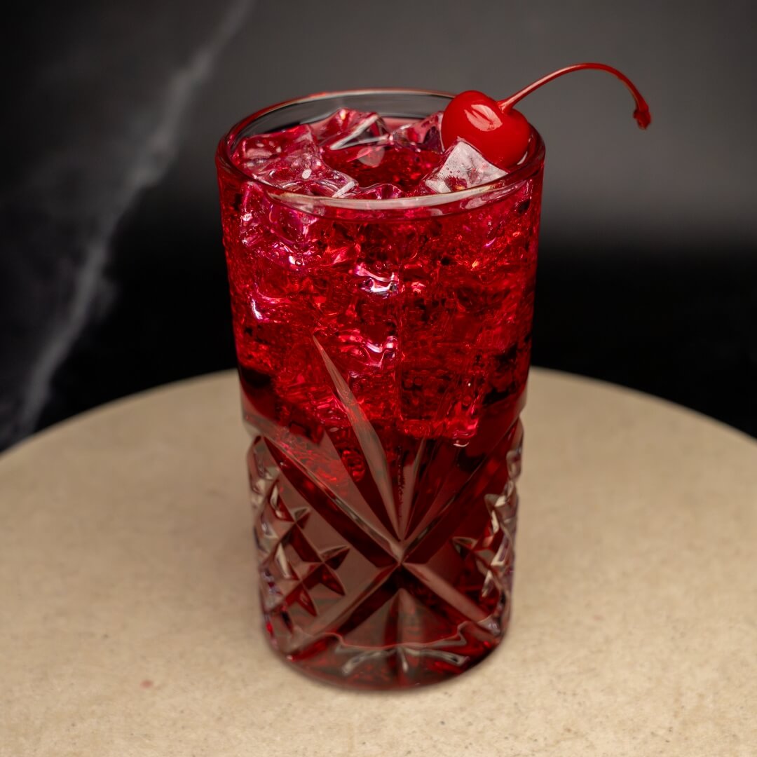 Video is of a red mocktail being garnished with a red cherry. Zooming out to see remainder of ingredients for the mocktail. Zooming back in to reverse the video effect on a wooden bench with stone background.